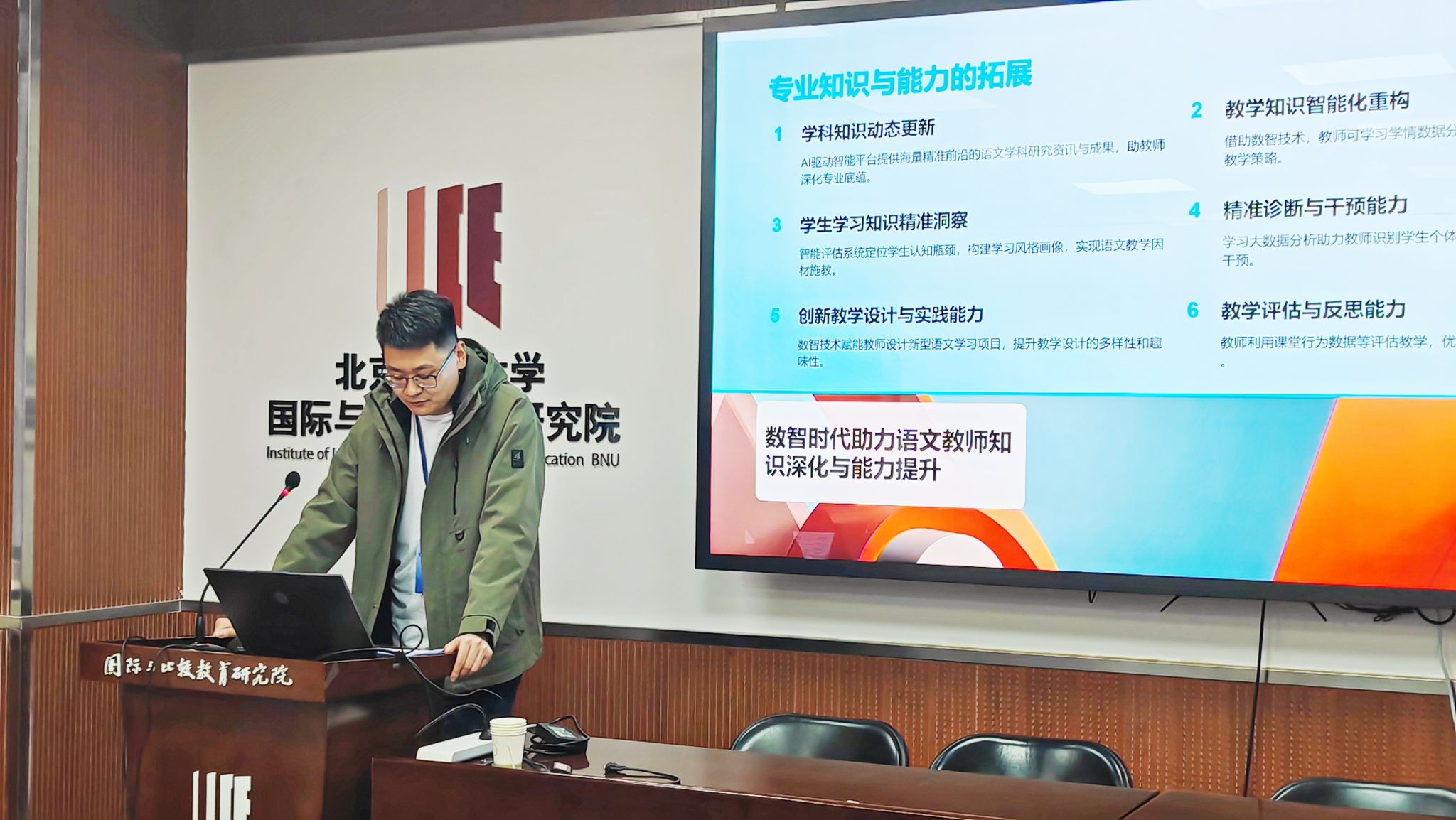 子会议下半场,温州大学应佳琪分享了静脉理论下初中语文单元教学策略;东北师范大学韩子续探讨了语文教师专业发展的相关理论并提出针对性应对策略;江西师范大学熊玲霞、欧阳芬老师指出人工智能背景下教师必须重构职业身份,“从知识权威到学习策展人”;西北师范大学苏文君基于现实写作教学困境建构了智能技术与项目式学习(PBL)深度融合的“双轮驱动”教学模式。崔绍怀教授针对各位学者的汇报,以AI技术利弊分析导入对汇报内容进行精彩的点评并呼吁语文教育研究要始终坚守语文学科本色。