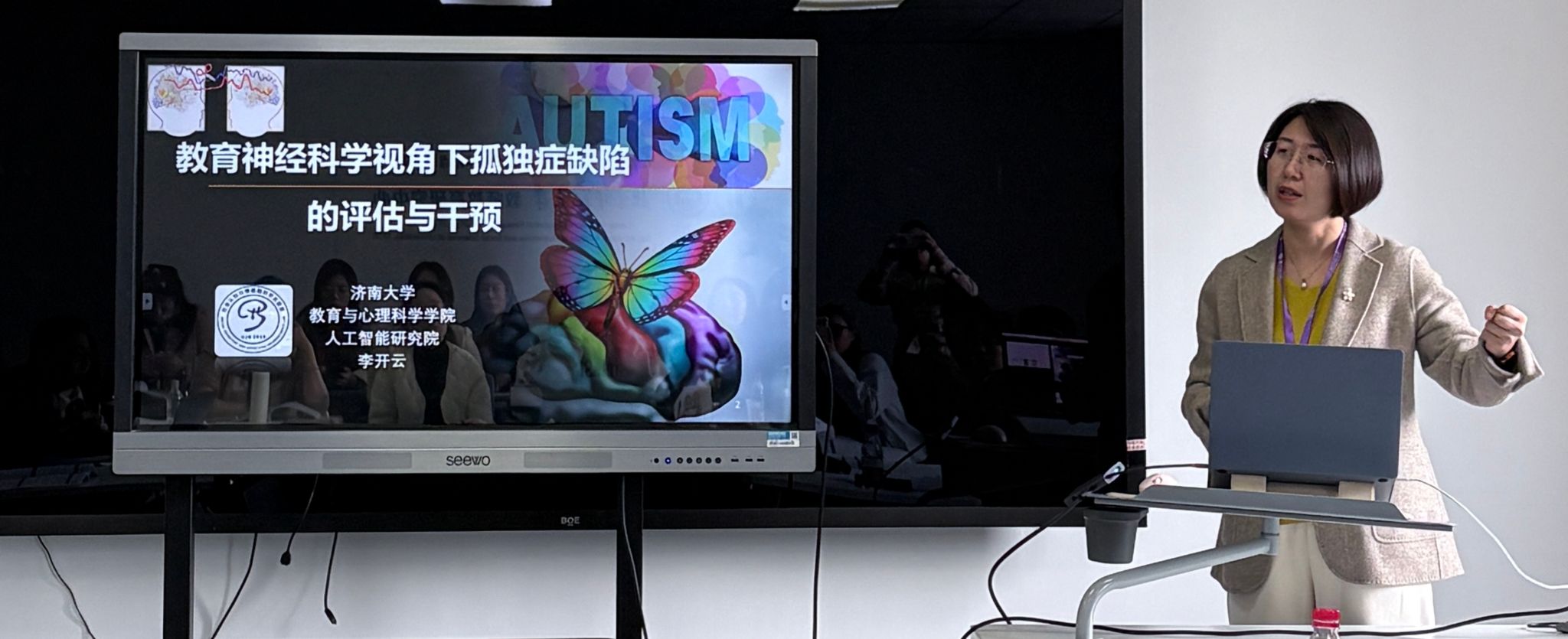 李开云教授作为特邀嘉宾作开场报告,题为“教育神经科学视角下孤独症缺陷的评估和干预”。她从教育神经科学的前沿视角出发,深入探讨了孤独症儿童的社交沟通障碍与干预机制,阐述了脑科学技术如何帮助理解孤独症的神经本质并探索科学干预的新路径。李教授指出,从神经科学角度研究孤独症,关键在于揭示“社会脑”之间的互动机制。孤独症儿童的社交沟通障碍,本质上是一种神经层面的同步缺陷。她强调,教育神经科学的最终目标,不仅在于改善儿童的行为表现,更在于为其提供长期、系统、个体化的支持,让科学真正走进课堂与家庭。“我们希望孤独症的孩子,也能拥有一个平凡的人生。”