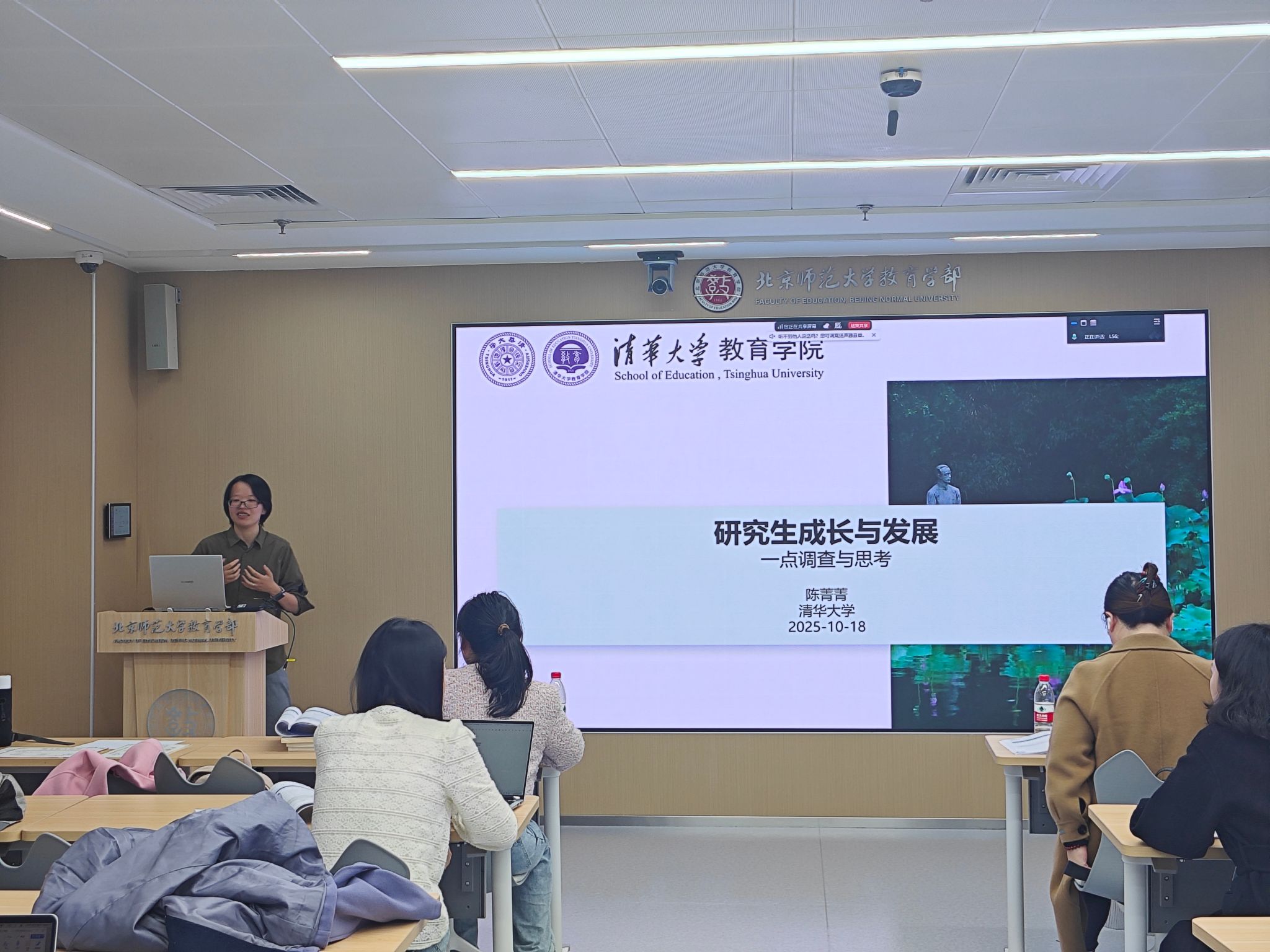 在上半场论文汇报结束后,博士生研讨营邀请到清华大学助理教授陈菁菁做题为“研究生成长与发展”专题报告。陈教授基于个人发展经历和调查研究,为在场博士生和青年学者带来了一场充满真知灼见又极具实操指导意义的职业发展分享。整场报告内容翔实、案例生动,在现场引发了热烈反响,为博士生们应对成长挑战、转变自身角色和规划未来发展提供了宝贵的建议。