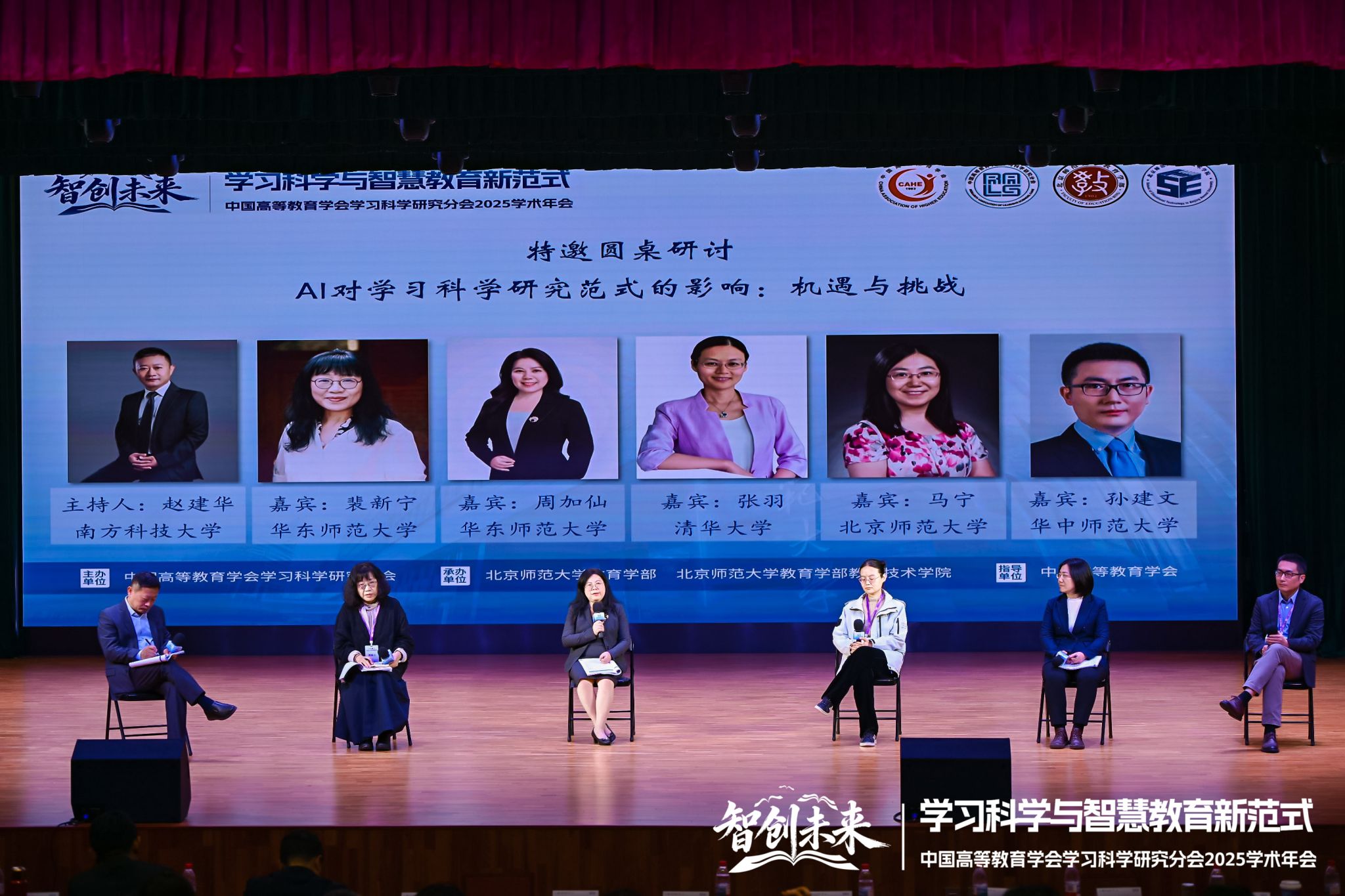特邀圆桌由南方科技大学未来教育研究中心副主任赵建华教授主持,嘉宾包括华东师范大学科学教育研究与教学中心执行主任裴新宁教授,华东师范大学教育神经科学研究中心副主任周加仙教授,清华大学教育研究院党委书记张羽教授,北京师范大学教育学部教育技术学院院长马宁教授,华中师范大学人工智能教育学部国家数字化学习工程技术研究中心副主任孙建文教授。多位专家齐聚一堂,围绕“AI对学习科学研究范式的影响:机遇与挑战”进行研讨,就人工智能如何重塑学习科学研究范式、带来的机遇与挑战等核心问题展开思想碰撞。