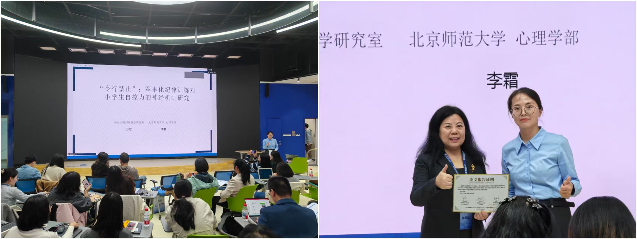 来自安徽省黄山市徽州区教研室的万欣团队带来了题为《“令行禁止”:军事化纪律训练对小学生自控力的神经机制研究》的实践探究。团队从执行功能理论出发,指出自控力本质上并非道德品质问题,而是一项依赖前额叶调控系统的核心认知能力,涉及抑制控制、行为监控与目标保持等心理过程。研究构建了“纪律动作程式化训练 + 指令反应延迟任务 + 行为反馈强化”三阶段教学设计,通过重复的程序性动作训练和即时反馈调节机制,提升学生前额叶执行网络效率,使自控行为从“外部被动约束”转向“内部主动调节”。研究验证了课堂中自控力训练的可行性,为长期困扰小学课堂管理与学习行为培养的问题提供了神经机制层面的解释与解决思路。