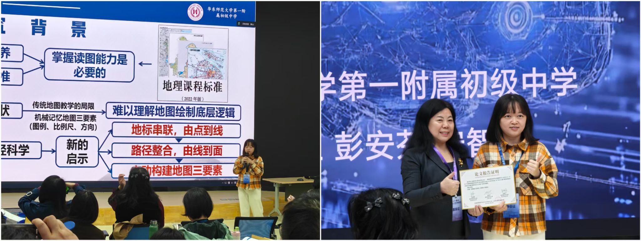 来自华东师范大学第一附属初级中学的安智睿团队以《激活空间认知——教育神经科学为地图教学注入新活力》为主题,展示了学习机制如何为地理学科教学赋能。研究指出,地图学习的核心在于空间信息的编码、转换与心智表征的构建,其背后依赖顶叶与海马区的空间认知神经网络。因此,地图教学不应停留在“图像识读训练”,而应发展学生构建“空间表征模型”的能力。团队通过“空间方位感知—符号图式构建—空间推理迁移”的学习路径设计,让学生完成从“看懂地图”到“用地图思考”的能力跃迁。其研究不仅拓展了教育神经科学在地理学科的应用,也为“认知机制进入课堂教学设计”提供了示范。