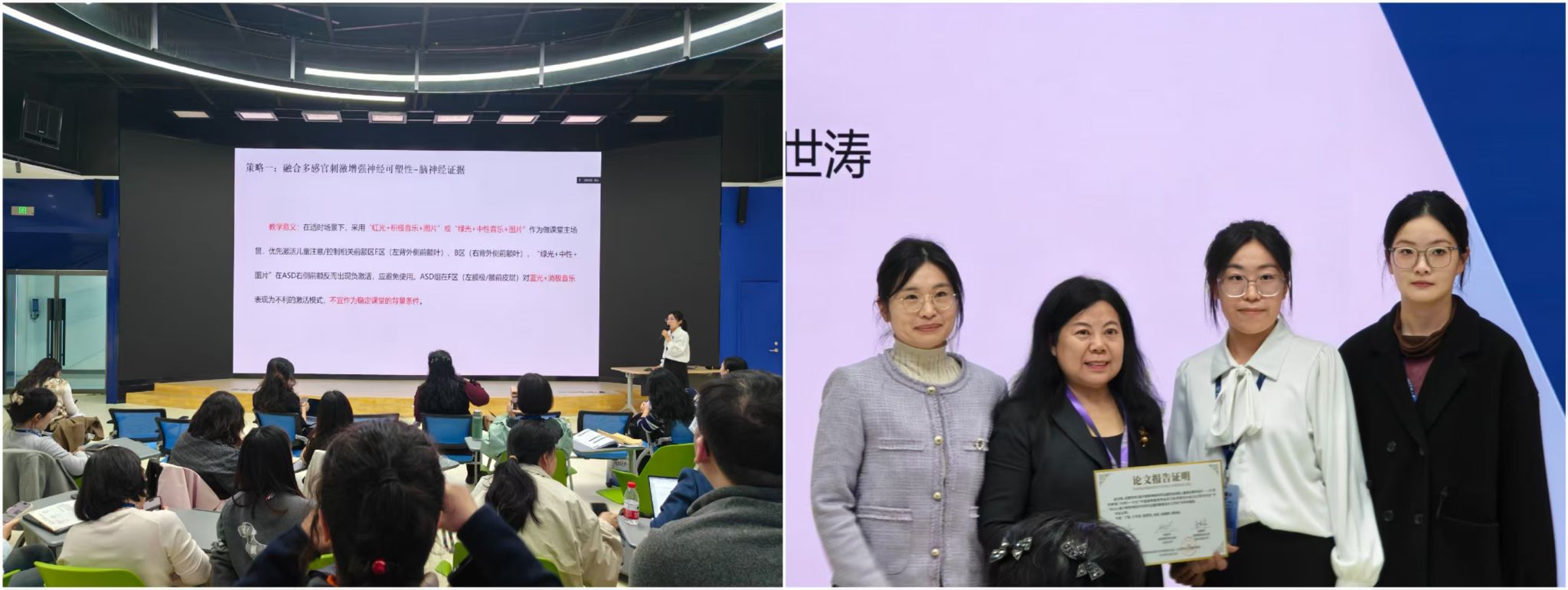 来自上海市虹口区密云学校的丁霞团队聚焦于自闭症儿童音乐学习的独特困难,开展了“基于教育神经科学证据的自闭症儿童音乐教学设计”研究。他们以《母鸡孵蛋》为案例,尝试将节奏感知、情绪调节与多感官整合等神经机制证据转化为可操作的课堂设计策略。报告强调,自闭症儿童在听觉加工、节奏同步与社会性注意方面具有明显差异,基于教育神经科学研究证据的音乐教学任务,有助于提升他们的音乐参与度与学习兴趣,能够有效改善自闭症儿童的脑功能连接、情绪调节与认知控制能力。通过将音乐结构拆分、利用视觉提示支持节奏理解、采用结构化的感官通路引导等方法,团队展示了一条“机制驱动—情境化—结构化”的教学路径。该案例不仅丰富了教育神经科学在特殊教育场域的实践维度,也为未来面向自闭症群体的艺术教育设计提供了可借鉴的范式。