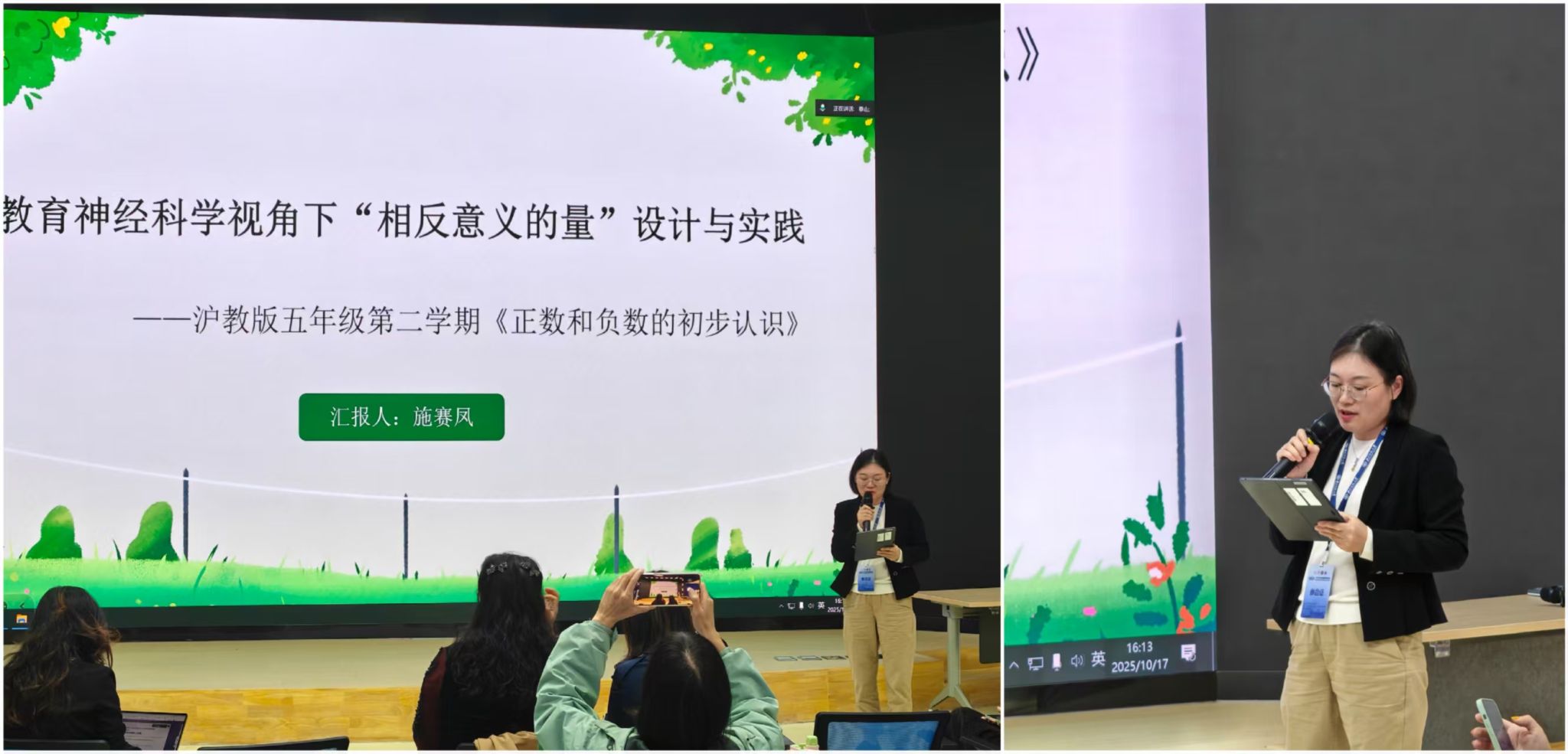 在数学概念教学方面,来自上海市虹口区广中路小学的施赛凤团队以“相反数”教学为例,提出数轴表征与双通道对称加工模型。他们指出,相反数教学困难的核心在于符号与数量关系的脱节。团队运用数轴动态可视化、颜色编码与对称推理支持策略,让学生在“方向—距离—意义”三维坐标中理解负数,降低了数学学习的认知负荷。