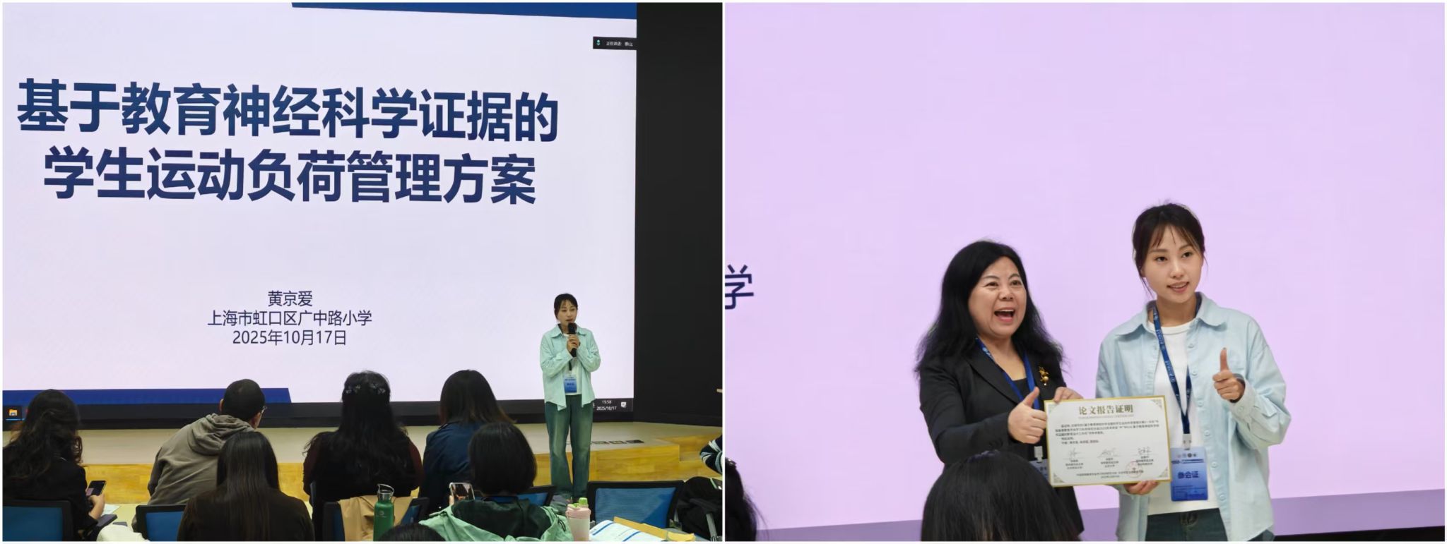 来自上海市虹口区广中路小学的黄京爱团队进一步从运动神经科学视角,展示了“基于教育神经科学证据的运动负荷管理方案”。他们指出,体育锻炼不仅提升体能,更通过促进脑源性神经营养因子(BDNF)分泌与海马区活动增强,改善记忆功能与注意保持能力。团队构建了“认知–运动双任务训练”结合“适度运动负荷调节”的课堂模式,实现在学业学习支持中的运动干预应用。他们的研究表明,适度运动是提升认知灵活性和注意稳定性的有效教育路径。